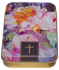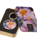 The keychain comes packaged in a metal tin with a navy blue base and a vibrant watercolored floral design that matches the design on the medallion.