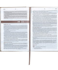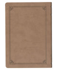 The Bible is covered in a beautiful tan faux leather, and gold gilt-edging is applied to the page edges. A heat-debossed frame with corner scroll designs embellishes both covers, and the spine features the title and two sets of heat-debossed faux spine ribs. The title is heat-debossed inside the frame on the front cover.