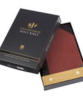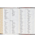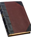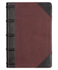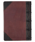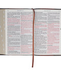 The two-toned full grain leather cover in rich tawny and brown tones is designed in a traditional portfolio look with topstitched accents and portfolio corners. Gilt-edged pages further complement the design, quality, and style. The detailed craftsmanship of the topstitching on the cover increases the durability of the leather and adds a subtle element of style to the Bible's overall look. The spine features a heat debossed title and gold foiled decorative spine ribbing.