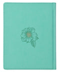 The silky-smooth teal faux leather hardcover of this KJV My Promise Bible is heat-debossed with striking flowers wrapped around a square heat-debossed frame. Gold foil accents the leaves and brings the flowers to life. The heat-debossed title is accented in gold-foiled scripted letters.