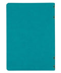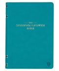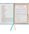 The flexcover Bible is covered in soft teal faux leather with an uncomplicated design: gold-foiled faux spine ribs and a gold-foiled title on the front cover.