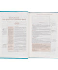 Luxury features of this Bible include a presentation page, gilt-edged pages, ribbon markers, a thumb index, and an index of authors and articles in the back. In addition, the presentation page in the front can be personalized and states the premise for the design of this beautiful Bible.