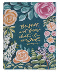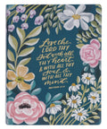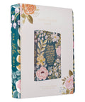 The covers of this KJV note-taking Bible are imbued with a bold and contemporary design that combines vibrant lilac, pink, and orange floral patterns. It has a rich, dark teal background that provides the perfect canvas for the debossed gold-foiled sentiment on the front cover.