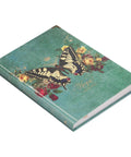 The journal's pearlescent hardcover exudes a subtle sheen, elevating and enhancing the various design accents. Its secret garden theme unfurls before your eyes, centering on an Eastern Tiger Swallowtail butterfly in shades of cream and charcoal. This intricate creature, flanked by vivid red and yellow roses, harbors an intriguing lock on its thorax, implying there is a key to unlock a mystery. A delicate, gold-foiled crown is poised atop the butterfly's head. The teal backdrop, embellished with gold-foiled calligraphy, perfectly complements the heartfelt sentiment that grounds the design at the lower edge of the front cover.