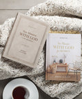 The soft, modern look of the hardcover devotional features a peaceful, minimalist living space with a natural wood bench and inviting woven cane chair. The title is presented in soft gold-foiled letters, centered on the white wall above the scene.