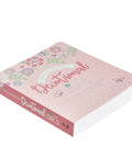 Flashes of silver-foiled hearts accent this pretty-in-pink softcover devotional book that is crowned by a row of pink flowers. The title is printed in bright pink letters that are outlined in silver foil and additional silver foil letters highlight the title further.