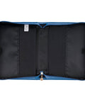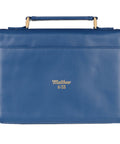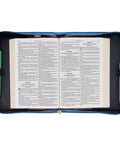 A lay-flat handle that folds out of the way when the Bible cover is opened is secured with gold metal handle hardware that matches the gold-toned zipper pull of the blue zipper closure. Inside the Bible case are two pen loops to store pens or highlighters.