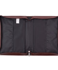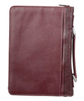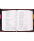 The spine holds a lay-flat handle that is secured with silver hardware. A silver cross-engraved zipper pull ensures the Bible case closes and keeps your belongings safe. Inside the case are two pen loops to hold writing utensils or highlighters. A slip pocket on the back panel can be used to store church bulletins or notes.