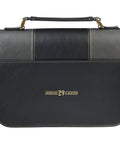 The faux leather Bible cover features a two-tone charcoal and black blocked design with charcoal gray outer panels flanking a smooth black center panel on the front cover. The black panel features the sentiment in a shiny gold-foiled typographical design.