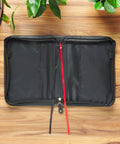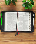 Shiny gold topstitching along the edges of the slip pocket and the seams of the Bible cover add dimension to the design and ensure a durable product. A black faux leather handle that folds flat is attached to the spine with gold metal handle hardware. Folding flat allows your Bible to open all the way. Inside the Bible case, you will find two elastic pen loops to store pens or pencils and two ribbon markers that are attached to the spine. These markers can be used to mark any passage, but traditionally, the red ribbon is used to mark passages from the New Testament, and the Black ribbon is used for the Old Testament. The Bible case closes securely with its black zipper and gold metal cross-engraved zipper pull.