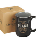The Plans Black Ceramic Coffee Mug will be your graduate's daily reminder that God cares for him and about his future. Armed with this promise and a steamy brew in this cup, he can start his day trusting God's hope and promises.