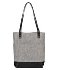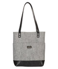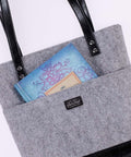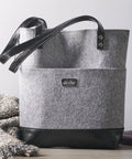 The tote's soft gray felt exterior is wrapped with an oversized pocket covering two-thirds of the body. A silver metal badge filled with black epoxy surrounding silver raised letters spells out the encouraging sentiment of the tote.