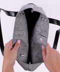 Carry your books in style with The Plans Heather Gray Felt and Black Faux Leather Fashion Bible Tote Bag —a tote with a handsome exterior and a roomy interior large enough to hold all the books, keys, and any incidentals you may need.