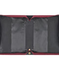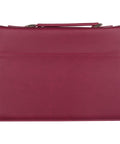 The spine holds a faux leather lay-flat handle, attached by gold-toned metal hardware that match the circular zipper pull. The zipper pull features an engraved cross. An exterior slip pocket on the back cover is useful for storing loose notes, and two convenient pen loops sit right inside the case, so you can keep all your note-taking supplies at the ready.