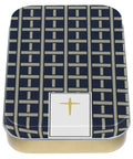 The keychain is packaged in a metal tin with a tight-fitting lid. The navy blue lid is decorated with a golden grid pattern and a thin embossed gold cross. This tin can be repurposed once the keychain is removed.