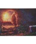The storage box displays a picture that depicts Jesus' empty tomb at sunrise. A shroud left neatly folded, and the stone rolled away from the opening, is the only indicator that he is not there. This beautiful image has a great mixture of color and texture and will be a pleasure to assemble.
