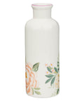 A gentle lavender-pink rim encircles the top, tying in with the florals and adding a feminine finish. The ceramic table vase has a slender silhouette with a flared rim. It stands roughly 8 inches tall, ready for a small bouquet or a single flower.