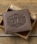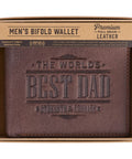 The World's Best Dad Brown Genuine Leather Wallet is part of the Best Dad Collection. This collection includes a key ring in a gift tin, a ceramic coffee mug, a 2-piece gift set containing a key ring and mug, a faux leather journal, a stainless steel water bottle, and a matching gift bag to hold your special gift.