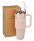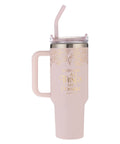 The pink powder-coated exterior of this stainless steel tumbler features a gold-foiled Victorian-era-inspired floral pattern encircling the top. The sentiment is written in gold-foiled letters on both sides of the cup.