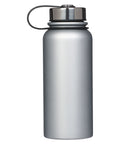 The glossy silver finish of the stainless steel water bottle features a typographical design in black and silver laser engraved letters.