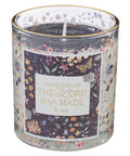 The candle’s glass jar bursts with color, wrapped in a lively floral design of coral, lavender, and cream blooms, accented with fluttering butterflies. A deep plum label on the front repeats the design and details the butterflies and flowers with gold-foiled outlines that complement the shining gold rim.