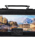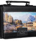 Lightly texturized black faux leather panels make up the front, back, sides, and spine of this faux leather Bible case, but the front is decorated with a full-color print of a majestic mountain towering over a forest of pine trees. The sentiment is heat-debossed and silver foiled on an appliquéd faux leather patch at the base of the picture.