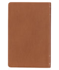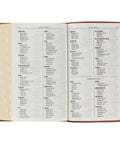 The soft toffee-colored full grain leather Bible cover is heat debossed with a gold foiled title on the front cover