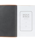 Topstitching detail around the Bible's edges adds interest and durability to the cover. Gold foil is also used on the spine titles that include the version reference and title.