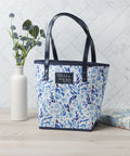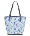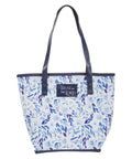 The bonnie blue botanical pattern of the white canvas tote bag creates a calming design that hints at spiritual growth. Strategically placed silver foiled accents add a subtle shimmer to the design. On the front panel, a blue faux leather patch is appliqued and embossed with silver lettering.