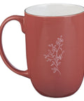 The front of the coral rose ceramic coffee mug features a line art design of a blooming blush pink twin-stemmed flower. Below it, the sentiment and Scripture references are presented in blush pink.