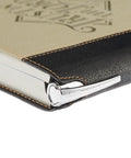 Black faux leather wraps around the back cover and spine, connecting to a sand-colored front panel with a double row of topstitching. The front panel is heat-debossed with a typographical design with a diamond-shaped frame.