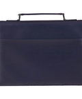 A navy blue faux leather panel is attached to the printed front panel. It wraps around the spine, where you will find a navy blue faux leather fold-away handle that is attached by silver metal hardware. Navy topstitching along all the seams and edges of the Bible case ensures a quality product. On the back panel, a slip pocket is added for storage. A blue zipper with a silver metal zipper pull that is engraved with a cross design keeps the contents of the Bible case secure.