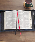 Inside the Bible case, you will find two ribbon markers attached to the spine. There is a red ribbon to mark passages from the New Testament and a black marker for the Old Testament. Two elastic pen loops to store pens or highlighters are also included.