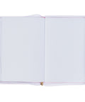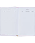 A light, smooth, blush pink faux leather cover makes this 12-month planner soft to the touch and easy to transport. A colorful floral design of pink roses with green and blue leaves surrounds the central gold-foil-outlined hexagon on the front cover that holds the gold and pink-foiled sentiment.