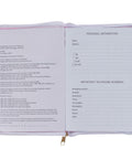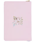 The back cover repeats the floral motif with a small floral bouquet in the center. Light pink topstitching surrounds both covers, and a pink zipper enclosure with a gold zipper joins the covers. An attached ribbon marker inside the planner keeps your place as you plan throughout the year.