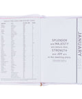 Each weekday day is broken down into half-hour segments that start at 7 a.m. and conclude at 8 p.m. Weekend days are less regimented, and there are 11 time slots that you can name yourself. Each day offers a Scripture verse for meditation and a suggested Bible reading passage based on a built-in Bible reading plan. The interior pages are printed in one color, and edge indexing allows easy reference.