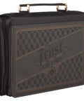 The Trust in the LORD Charcoal Faux Leather Bible Cover is part of the Trust in the LORD Charcoal and Brown Collection that includes a ceramic coffee mug, a metal key chain, a faux leather Bible cover, a wirebound journal, a gift bag, a faux leather journal, and a reusable non-woven shopping bag.