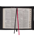 The Bible case has a chic black back panel that wraps effortlessly around the spine, where it is attached to the light graphite gray front panel by a double row of topstitching. The front panel is trimmed with a geometric diamond-shaped design, hemmed by a shimmering gold-foiled frame. A smooth gray diagonal band, outlined in gold foil, cuts across the design, showcasing the sentiment in bold, black, embossed letters. Below the sentiment, a round, heat-debossed medallion accented with more gold foil displays the Scripture reference.