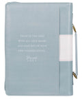 A subtle sheen is evident on the pewter faux leather used to construct the Bible case. A light taupe band, adorned with pink and purple blooms, extends across the front panel, wraps around the spine, and tucks behind a slip pocket on the back panel. The sentiment is elegantly displayed on the taupe band in scripted copper-foiled letters complemented by taupe block letters.