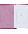 A zipper closure with a gold metal zipper pull securely closes the covers of the journal, and a satin ribbon marker is included to quickly find the page you are journaling on. The journal includes a presentation page to inscribe with a message when it is given as a gift. Inside the journal, 366 lined interior pages, each feature a Scripture verse that can be used as a journal or prayer prompt.