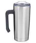 The 18 oz travel mug has a durable black handle that comfortably accommodates three fingers, and its slim profile fits most car and truck cup holders. The dual-wall design maintains your beverage's temperature, whether you're sipping something hot or ice-cold, while the retractable sip-hole cover and silicone-sealed pull-off lid help prevent spills. A non-slip base ensures your mug stays steady wherever you set it down. Hand-washing is recommended to preserve the lettering.