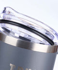 The exterior of the camp-style mug is powder coated in a matte gray finish. The sentiment is laser engraved in large silver lettering on both the front and back of the camp style mug.