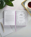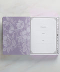 The devotional's purple theme is reinforced by shiny purple gilt-edging on the page edges. A purple ribbon marker continues this trend. A presentation page welcomes you to the interior of the devotional, followed by a repeat of the cover design and a verse that is the inspiration for the devotional.
