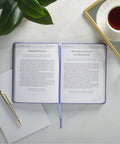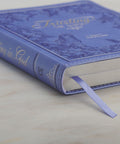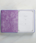 The beautiful lavender faux leather is heat-debossed with pretty florals and perching birds framed by a silver-foiled border. The design encircles the title and sub-title, which are presented in silver-foiled letters.