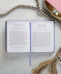 Silver gilt-edging on the page edges coordinates well with the overall purple palette of the devotional that includes a purple ribbon marker. Inside the devotional, you will find a presentation page followed by a repeat of the cover design and a verse that is the inspiration for the devotional.