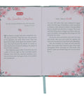 Large heat-debossed flowers with gold-foiled pistils trim the edges of the teal faux leather devotional. At the center of the design, the title is represented in heat-debossed and gold-foiled letters.