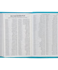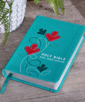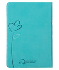 The back cover shows a single heat-debossed tulip. Matching topstitching along the edges of the Bible adds strength and durability to a beautiful design while silver gilt-edged pages and a turquoise satin ribbon marker adds a touch of luster.