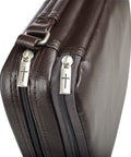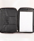 Bless the organized man or woman in your life with the Two-fold Dark Brown Faux Leather Organizer Bible Cover to help them study the Bible in an organized way.Double row topstitching divides the front cover of the dark brown faux leather cover into three sections. A silver oval badge, engraved with the classic Ichthus fish symbol, is placed in the center of the bottom panel and coordinated with the silver hardware that secures the brown faux leather handle.The two zippered compartments of the Bible case provide plenty of space for your Bible, a notebook, pens, paper, and more. The first compartment has a slip pocket to secure an included notepad on one side and another slip pocket for loose paper, three credit card holder slots, and 4 pen loops on the other side. The second compartment has two slide-in pockets to securely hold the covers of your Bible, a zipped mesh pocket (M, L, and EL only), and an additional pen loop that holds an included pen/highlighter combo. Both compartments close with zippers with two silver cross engraved zipper pulls. This Bible cover is available in six sizes: extra-small, small, thinline small, medium, large, and extra-large.