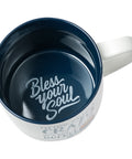 This ceramic mug is white with the main design on one side. The sentiment is written in alternating gray and blue fonts that'll match anyone's style! The interior of the mug is dark blue to match the exterior font. When you finish your cup, you'll find the Bless Your Soul imprint at the bottom of the mug for fun encouragement.