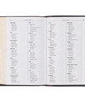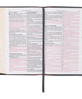 This Deluxe Gift Bible features black full grain leather front and back covers with reinforced edges. A smooth brown spine is attached to the front and back panels with a double row of topstitching. Elevated spine ribs are reminiscent of the ancient bookbinding technique where pages were sewn together. Each spine rib is accented by gold foiled bands for an understatedly elegant look. The title and version reference appears only on the spine and is gold foiled and clearly visible.